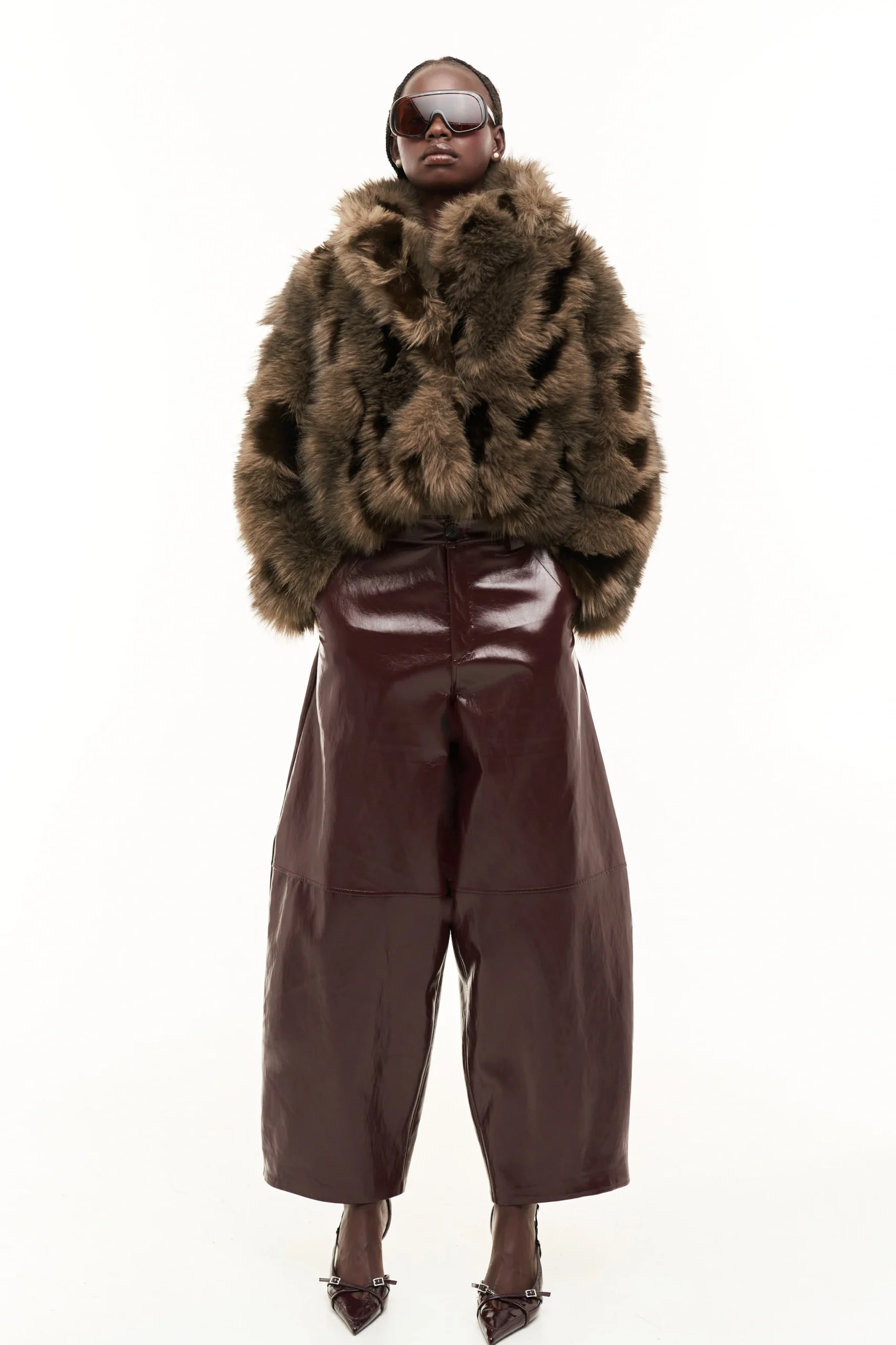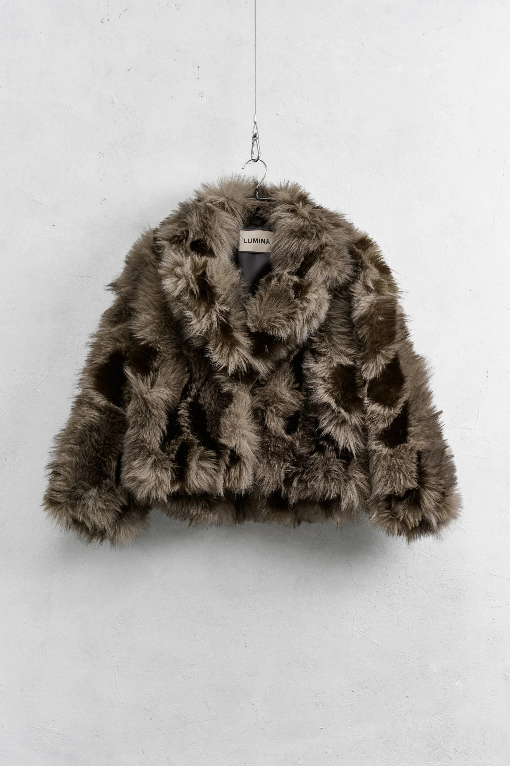 Συνθετική γούνα με γιακά πέτο και animal print μοτίβο. Διαθέτει μπροστινό κλείσιμο με κλιπ κουμπί και δύο πρακτικές τσέπες.