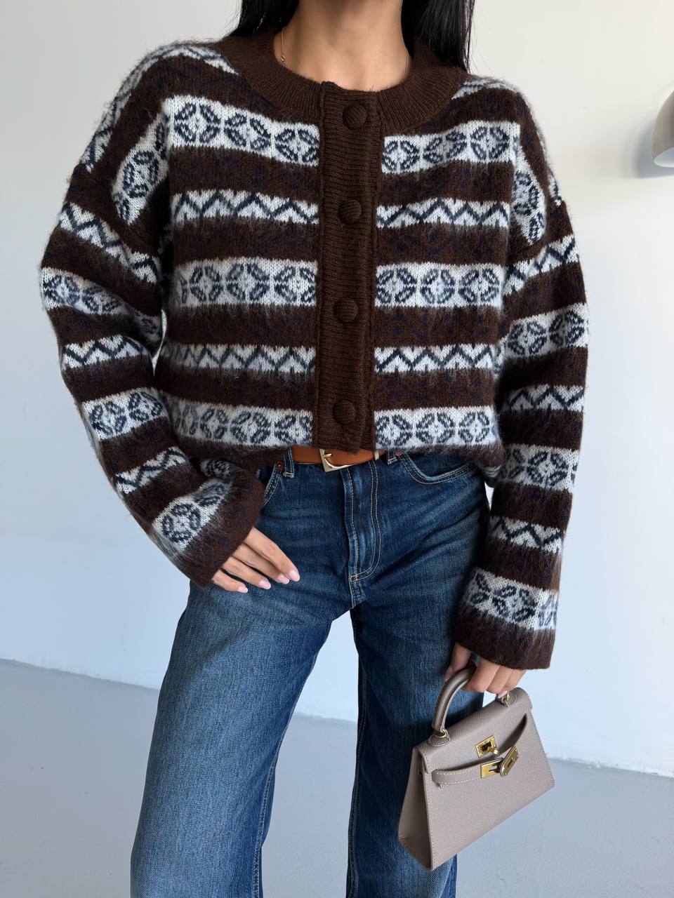 Διαθέτει στρογγυλή λαιμόκοψη και κλείσιμο μπροστά με κουμπιά.