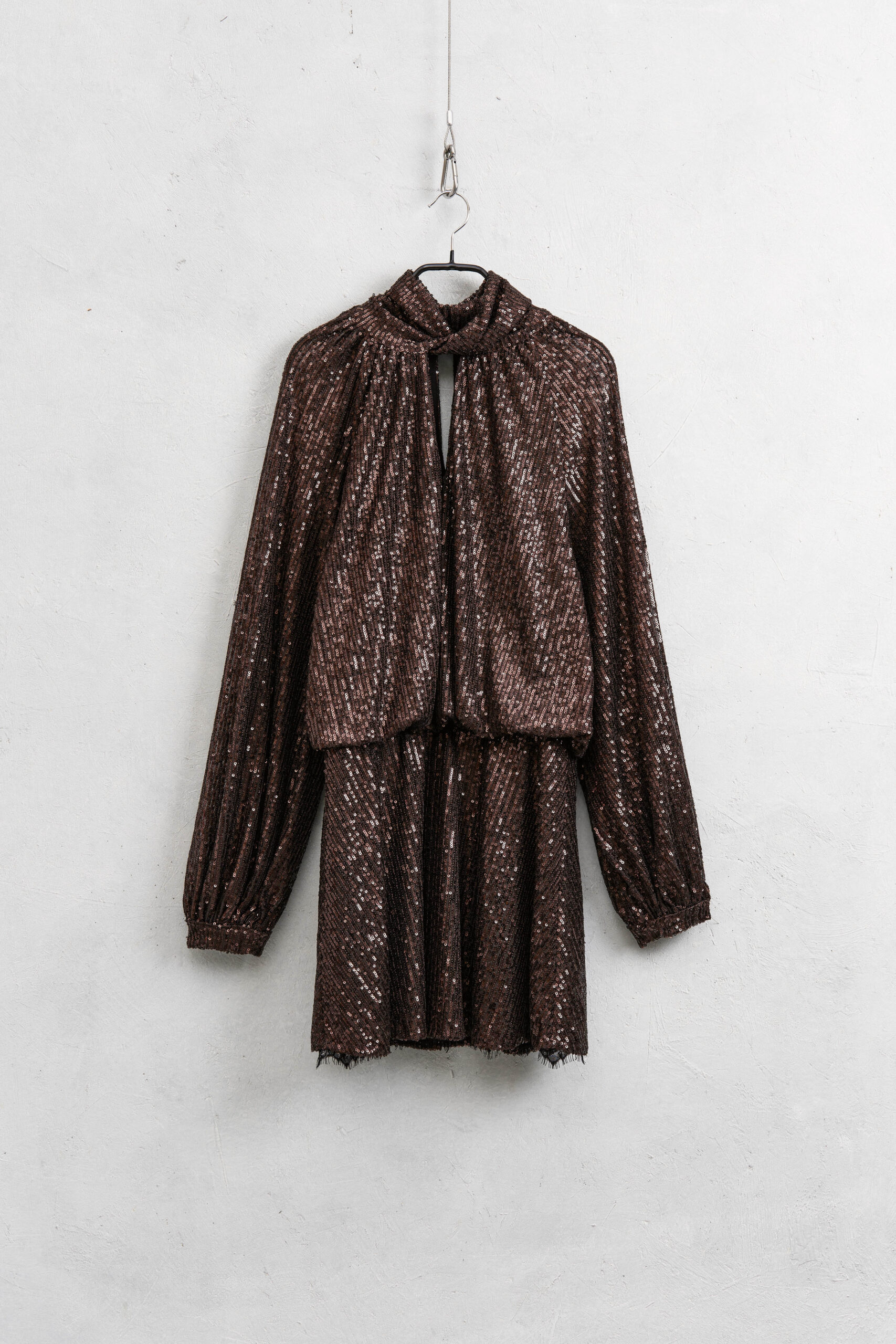 Κοντό φόρεμα με παγιέτες, ψηλό σταυρωτό ντεκολτέ και μακριά μανίκια.