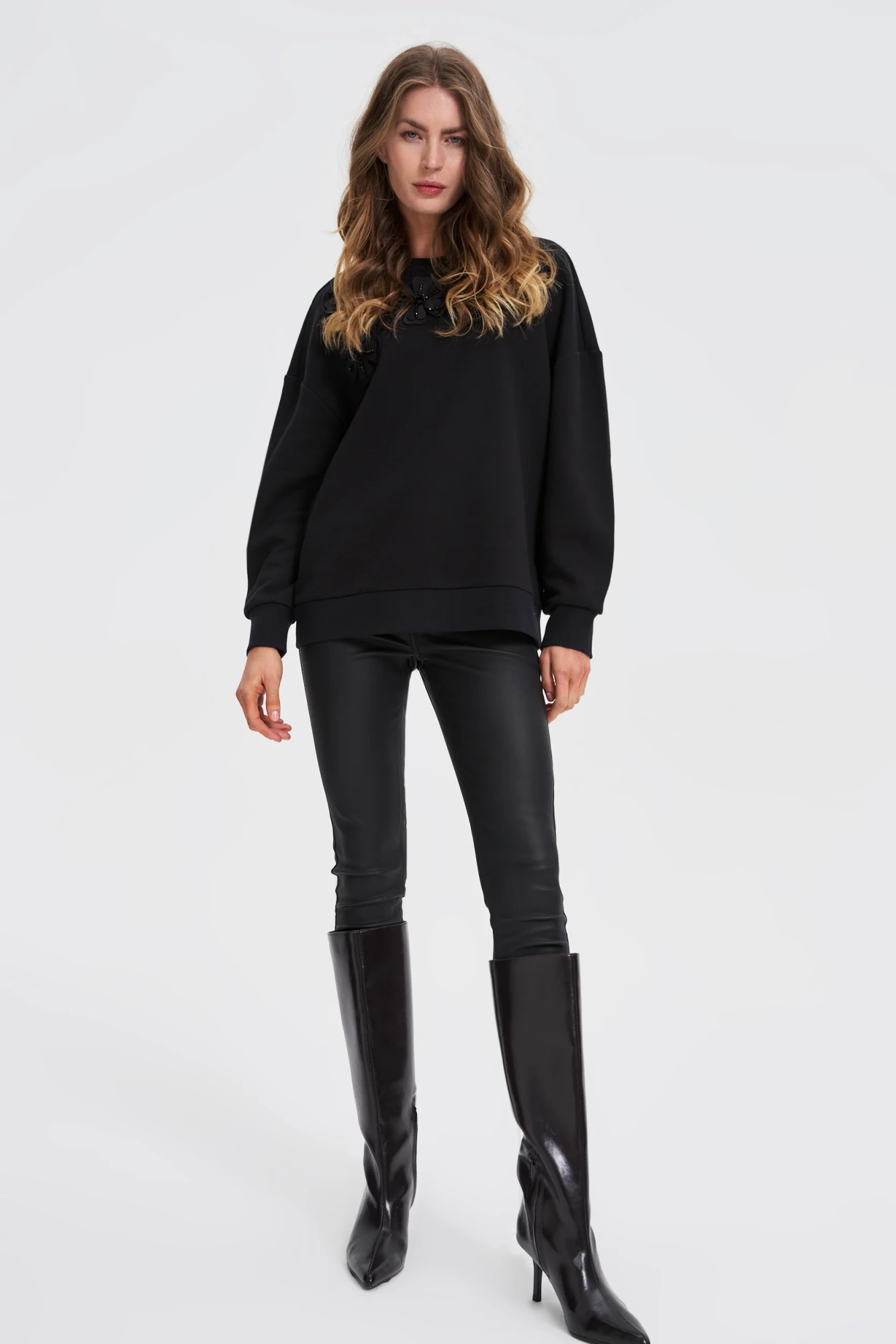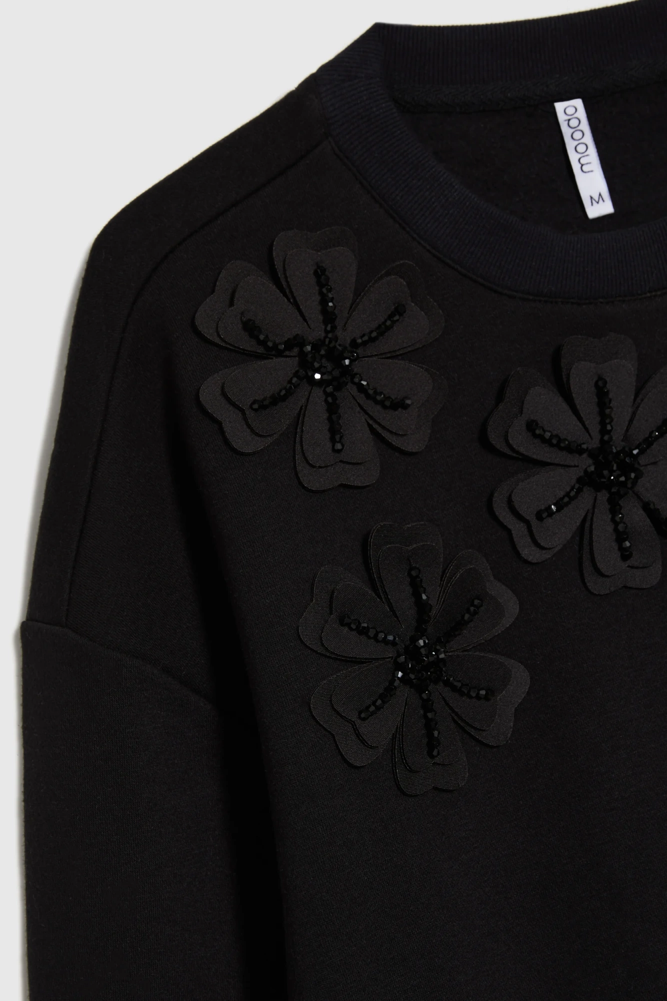 Μαύρο φούτερ με φλις επένδυση και διακοσμητικά σχέδιο με λουλούδια και στρας.