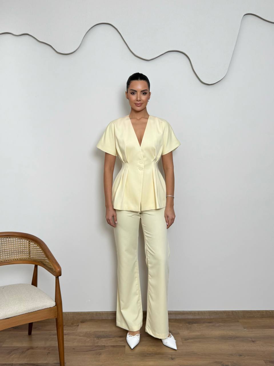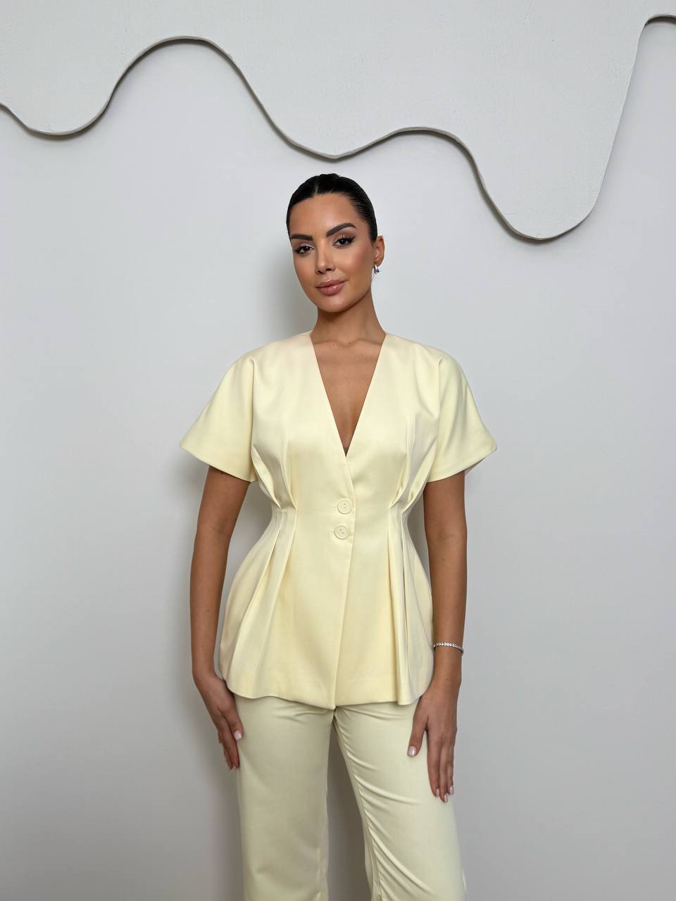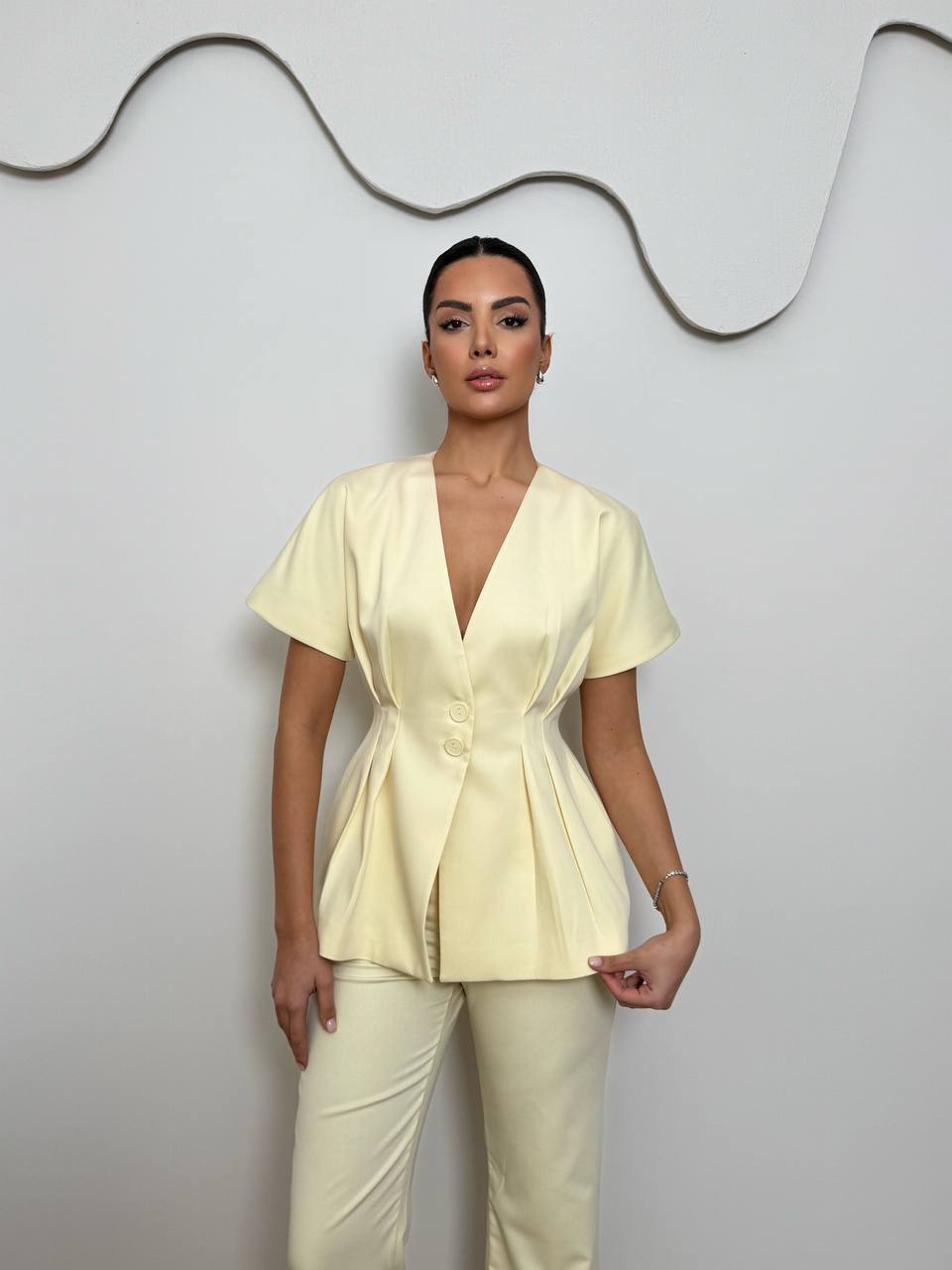 Σετ σε κίτρινο χρώμα.Το πάνω μέρος διαθέτει κοντό μανίκι,στενή εφαρμογή στη μέση και κουμπιά.Το παντελόνι διαθέτει ίσια γραμμή και λάστιχο στη μέση.