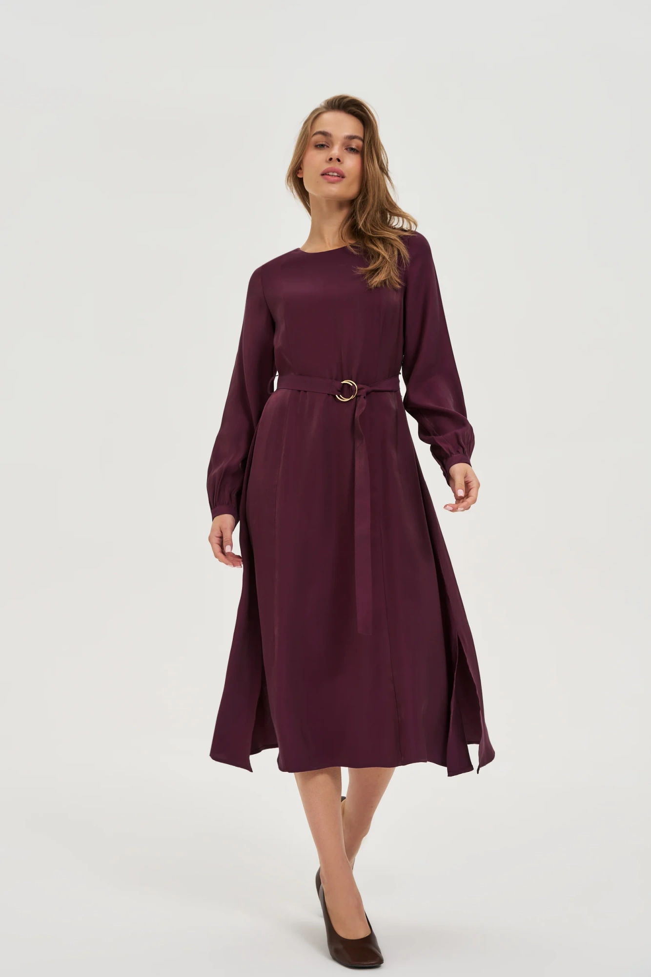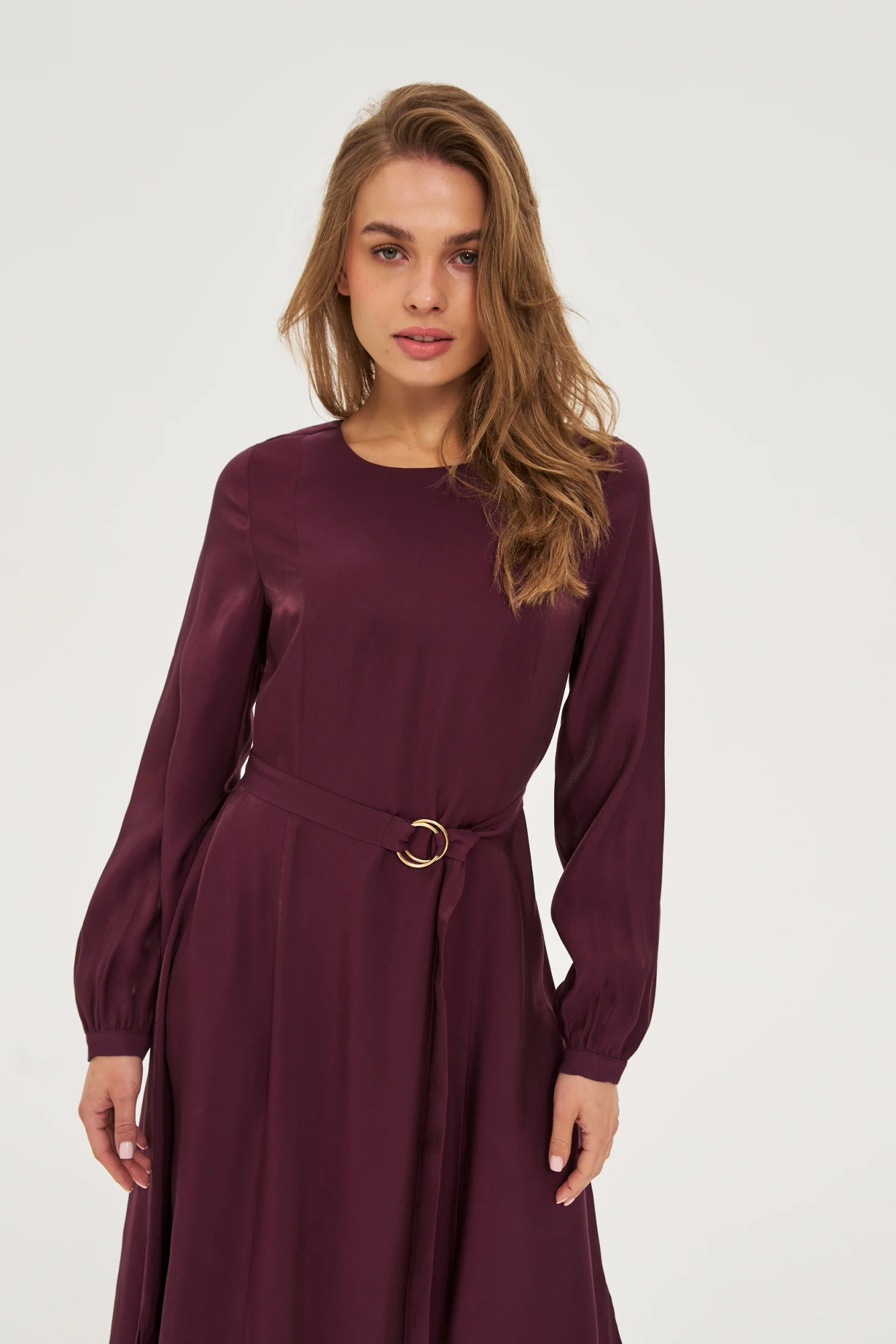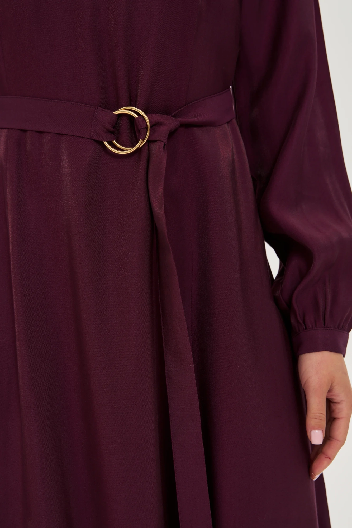 Μίντι φόρεμα σε μπορντό χρώμα , με ζώνη στη μέση και μακριά, ελαφρώς φουσκωτά μανίκια.