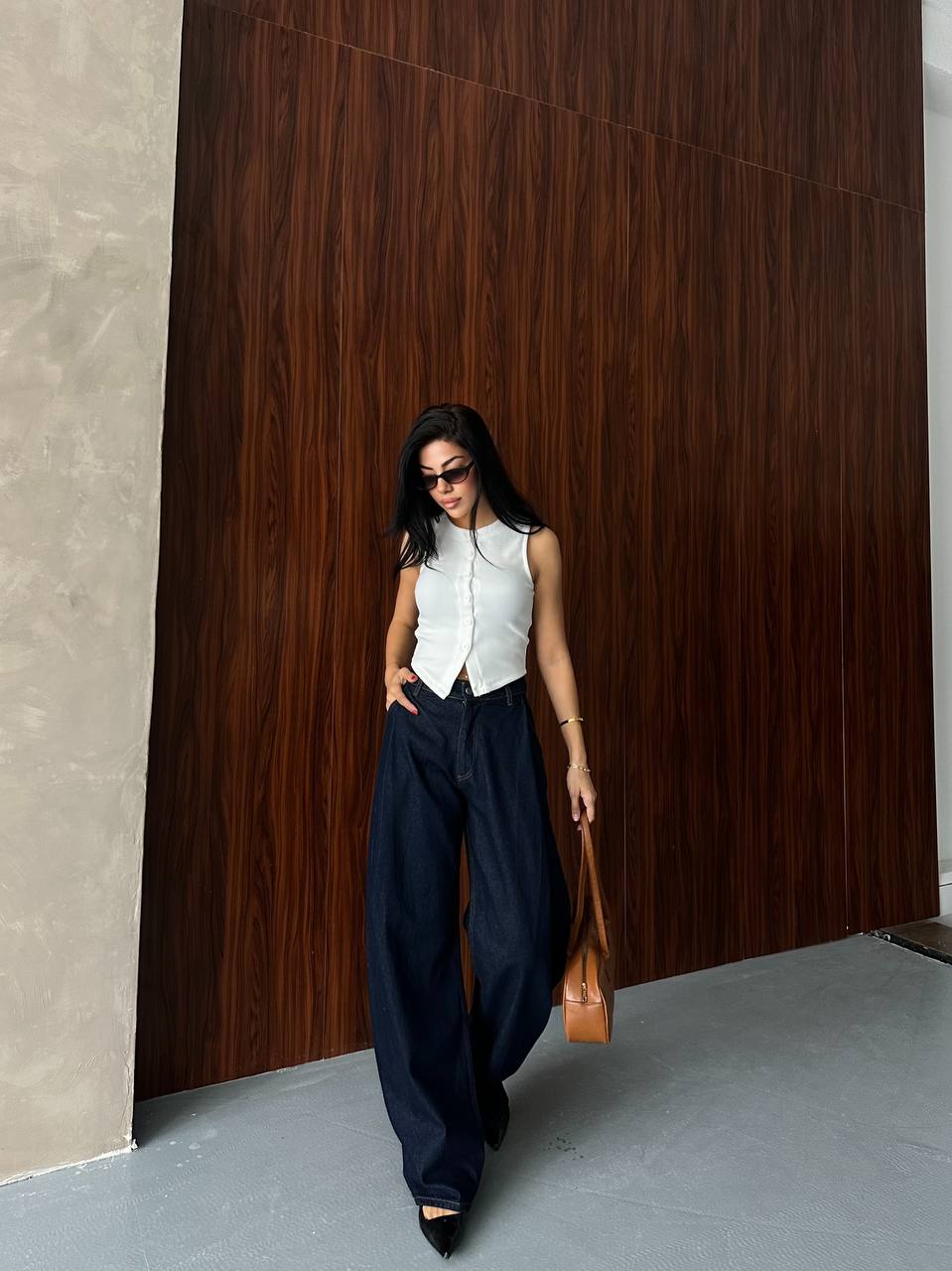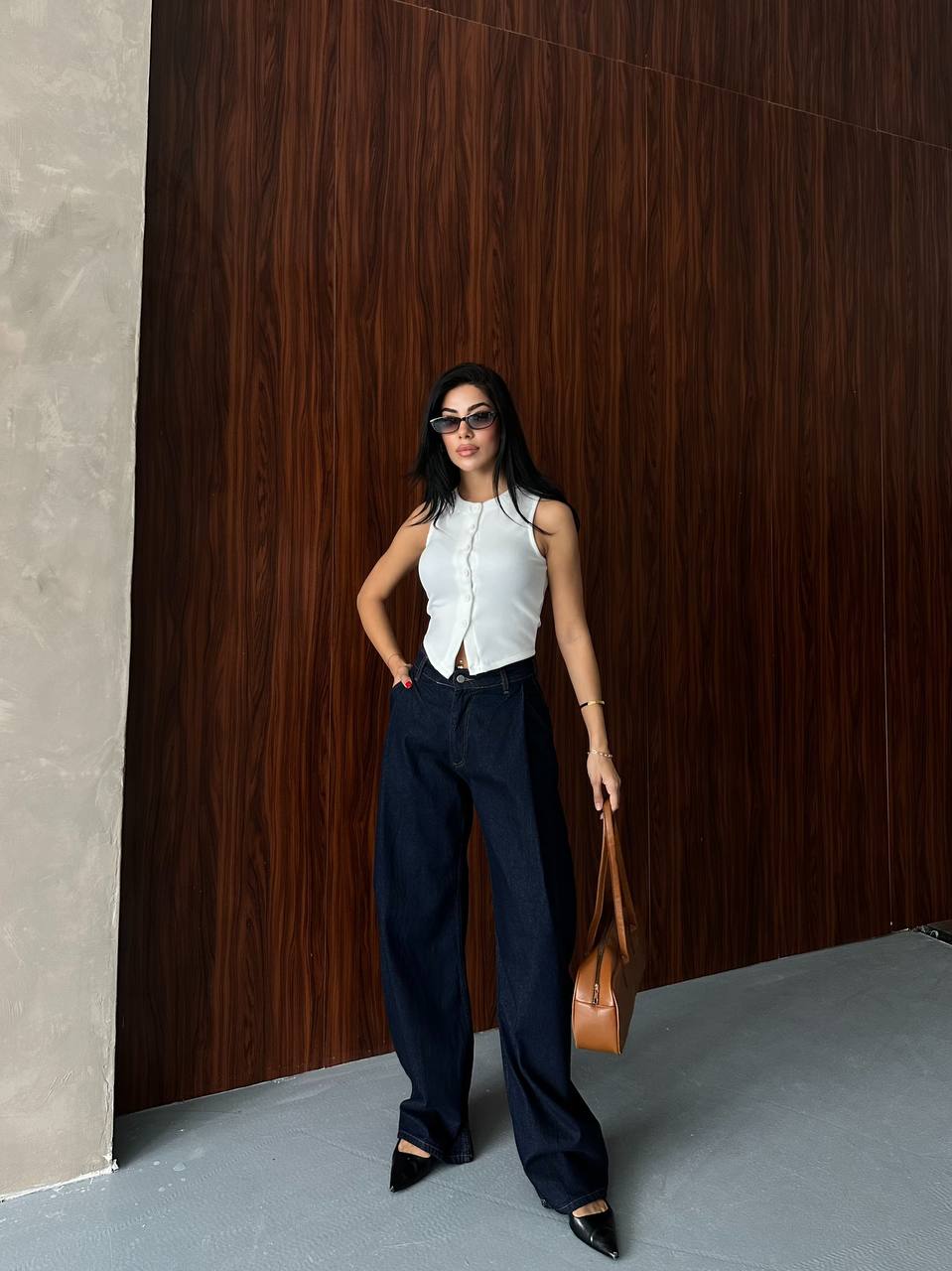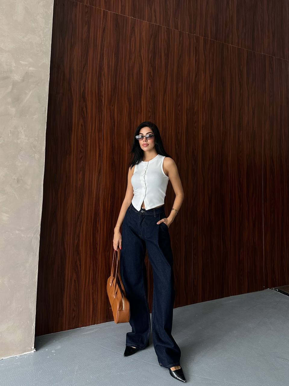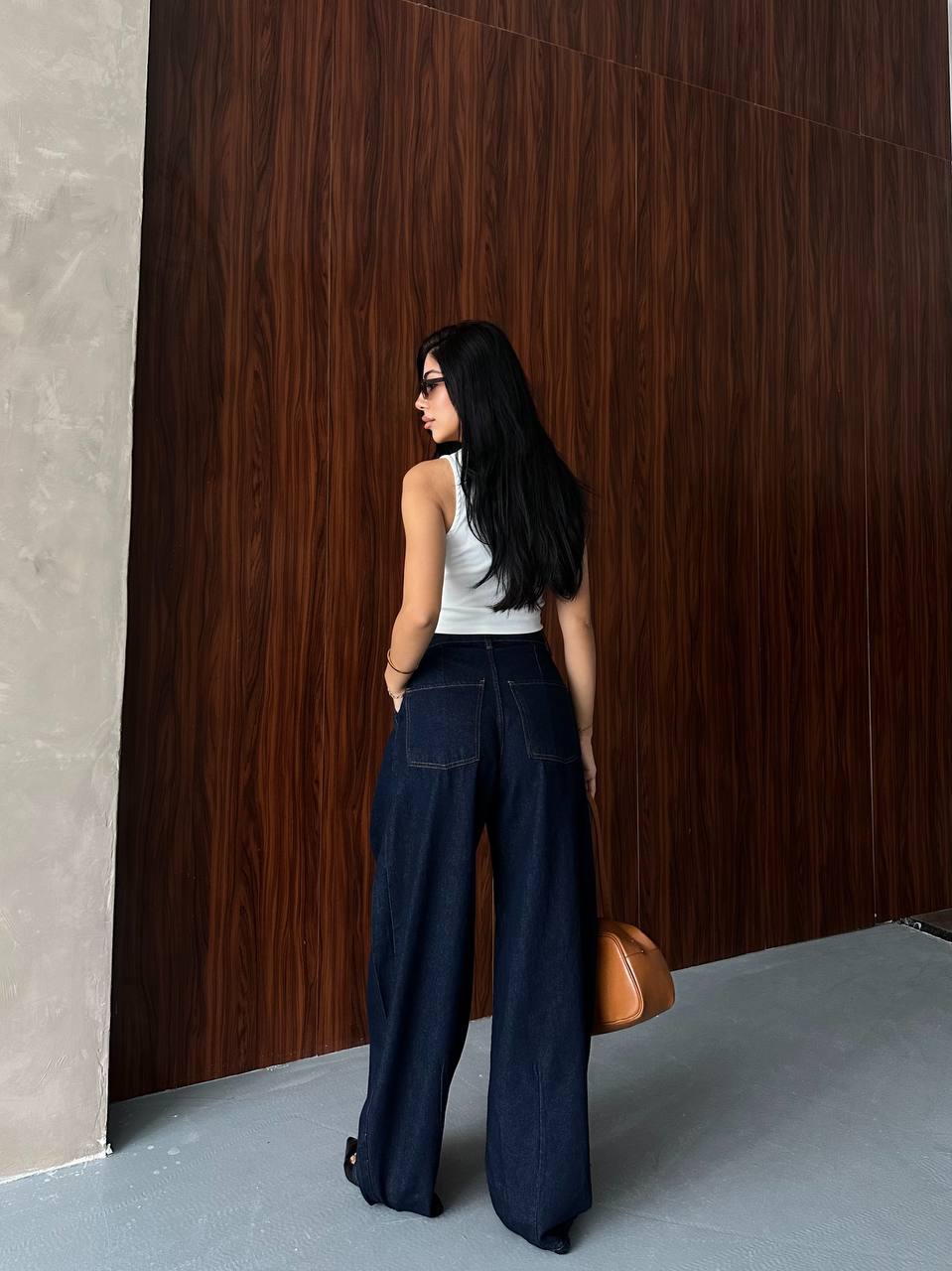 Ψηλόμεσο σκούρο μπλε balloon jean . Διαθέτει κλείσιμο με φερμουάρ και κουμπί μπροστά.