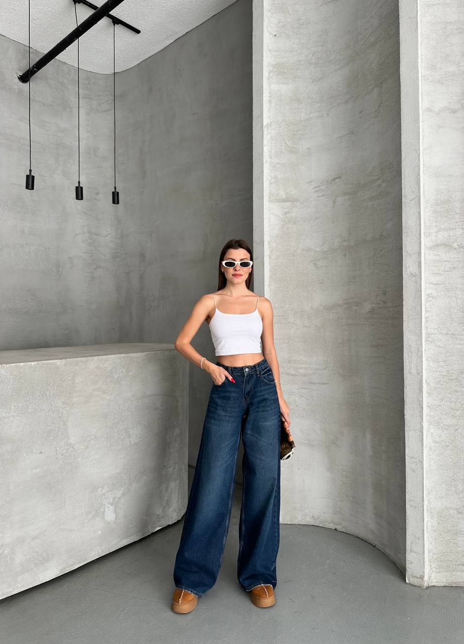 Midwaist baggy μπλε jean με ξεβάμματα . Διαθέτει κλείσιμο με φερμουάρ και κουμπί μπροστά.